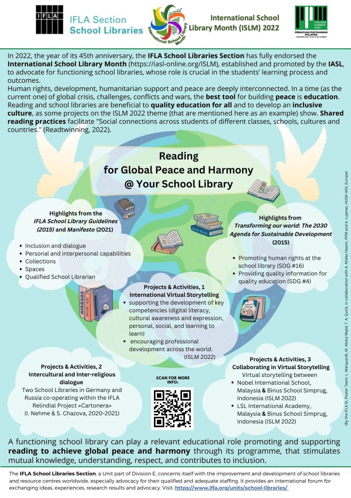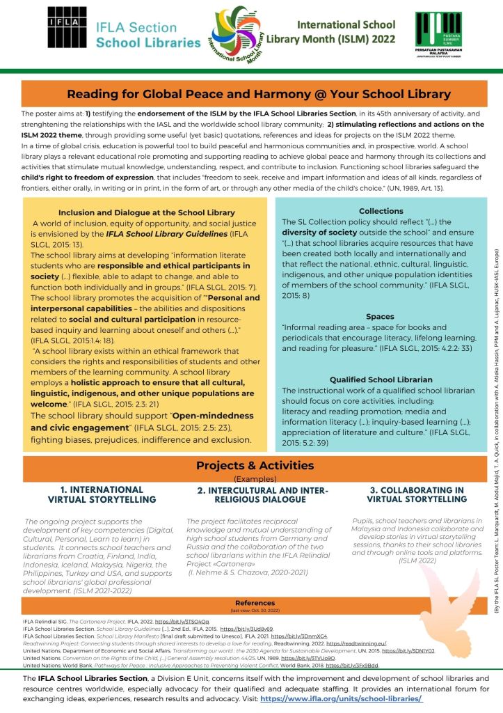Some of the project activities are virtual storytelling, poster competition, bookmarks exchange, etc. The project activities were presented at the annual IASL conference in July 2022 and at the annual conference of Malaysian librarians in May 2022. International storytelling enriches everyday life in the partner schools from Croatia, Finland, India, Indonesia, Iceland, Malaysia, Nigeria, Turkey, Greece and the USA.